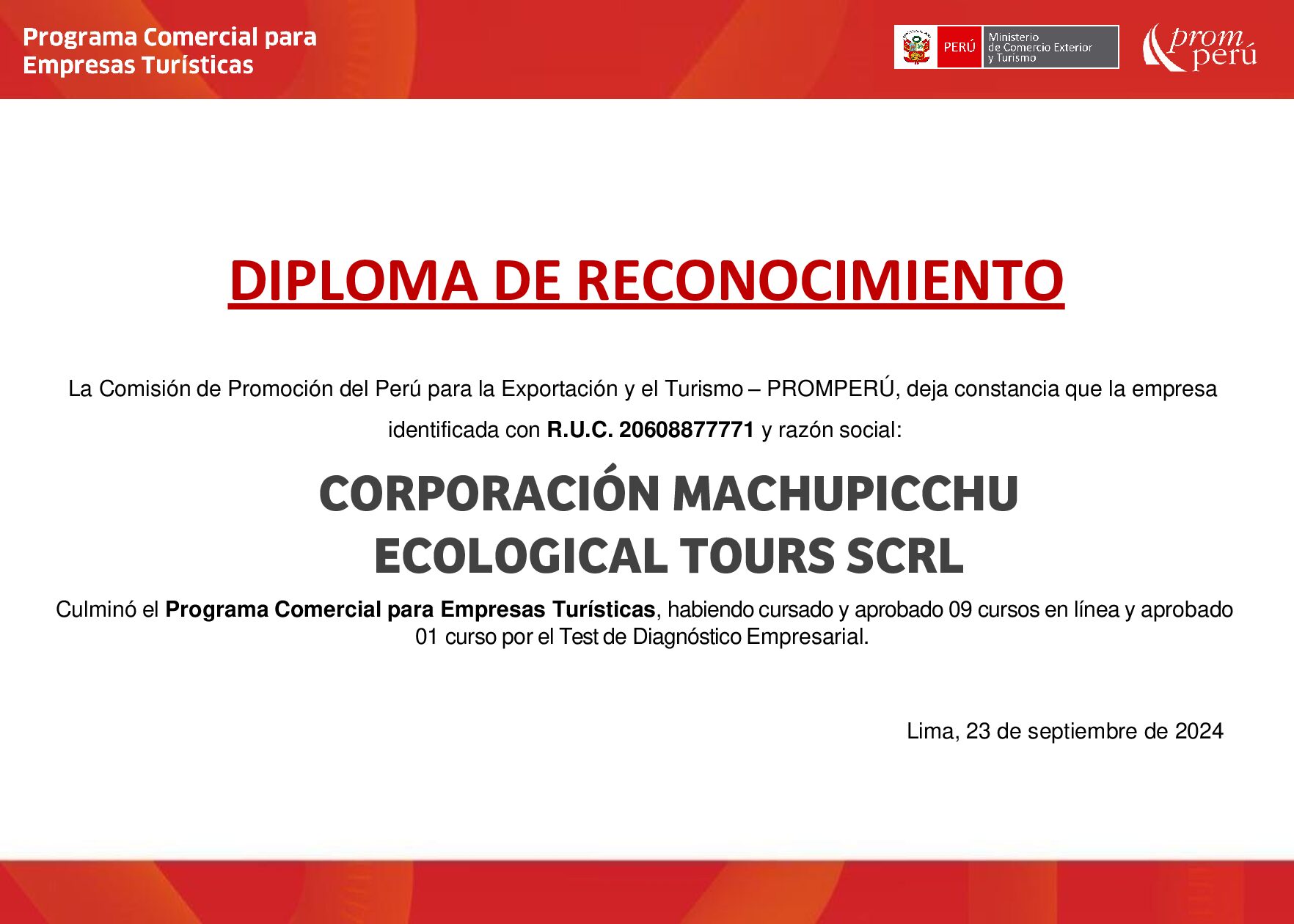 Machupicchu Eco Tours S.R.L, como operador turístico reconocido, está totalmente comprometido con adherirse a los más altos estándares de viajes locales e internacionales. Nuestra misión es ofrecer experiencias de viaje seguras, placenteras y enriquecedoras, asegurando que cada detalle de su aventura sea cuidadosamente planificado y ejecutado con excelencia.